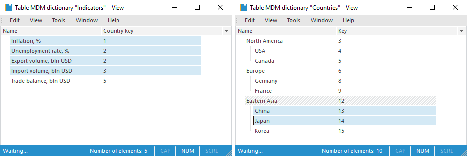 For example, the data consumer contains the Indicators dimension and the data source contains the Countries dimension. The dimensions contain the following data and the following selection: