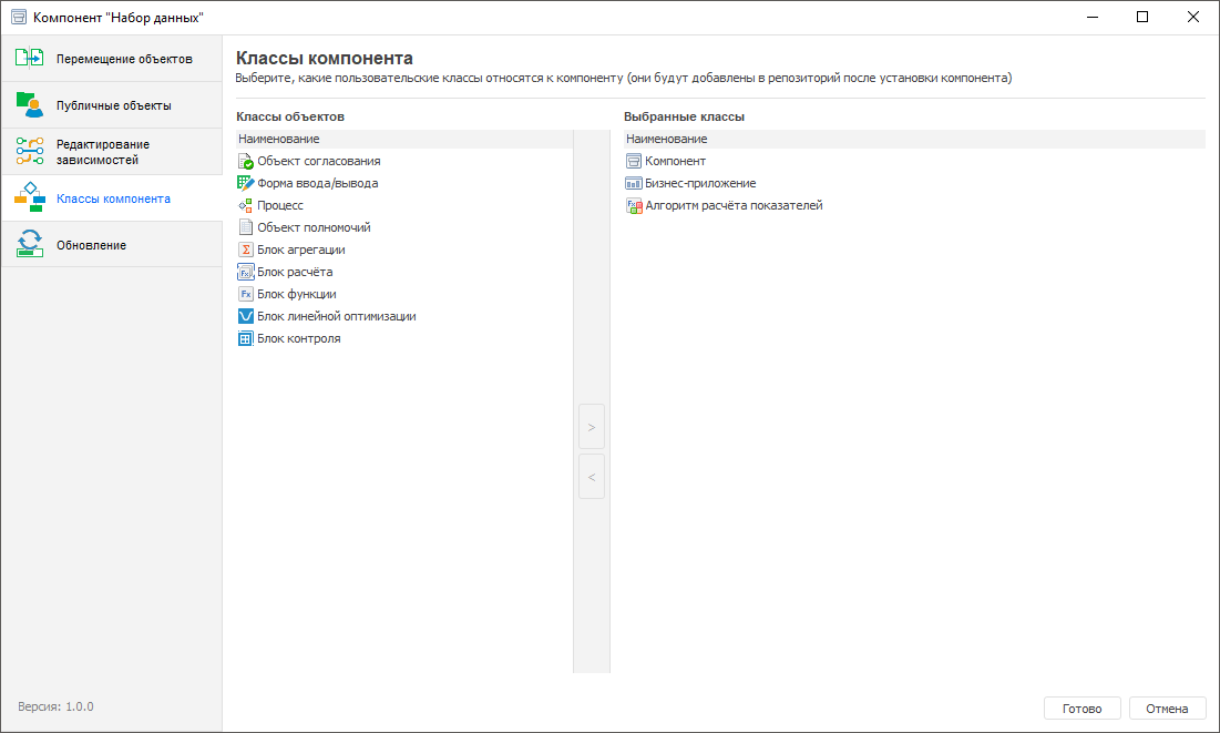 NOTE. The list of selected classes is specified by objects that are used for work in the component. For example, on working wit calculation algorithms, this object class must be added to the component.