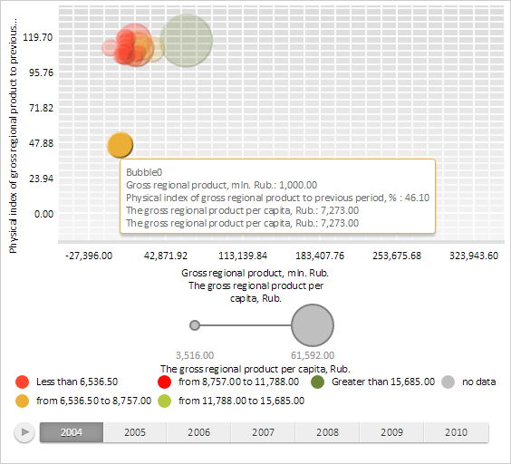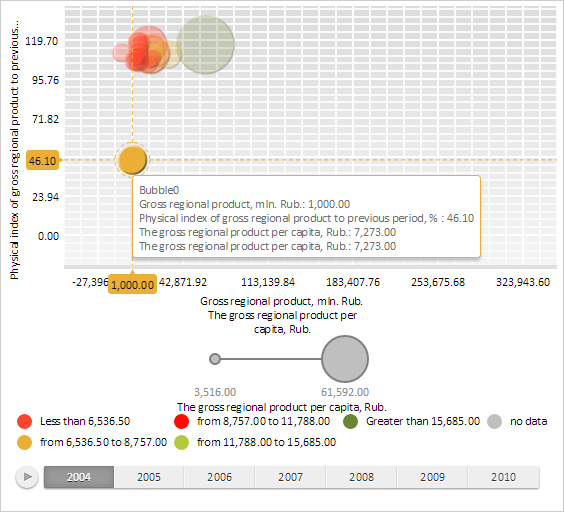 To execute this example, the HTML page must contain the BubbleChart component named bubbleChart (see Example of Creating the BubbleChart Component). Select the first item in the bubble chart by hovering over it: