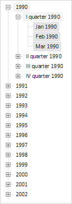 To execute the example, the HTML page must contain the DimTree component named dimTree (see Example of Creating the DimTree Component). Expand the first tree element. Expand the first element of the first element. Set if selected elements are expanded. Select all element of the second level: