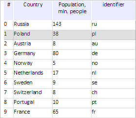 To execute the example, the HTML page must contain the DataGrid named grid (see Example of Creating the DataGrid Component). Point the cursor to the row with the number 1. As a result the row with the number 1 is highlighted: