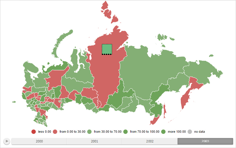 To execute the example the HTML page must contain the MapChart component named map (see Example of Creating the MapChart Component). Create a bar factor for a map layer area with the RU-KYA identifier containing axis and showing data only for the first time period: