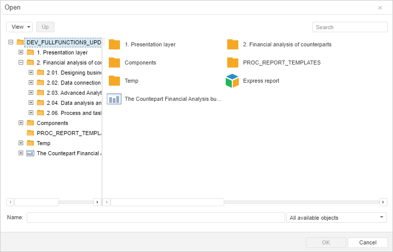 To execute the example, the HTML page must contain the MetabaseDialogBase component named metabaseDialogBase (see. Example of creating the MetabaseDialogBase component). Set the Large Icons view for the list of objects in a basic dialog box with repository: