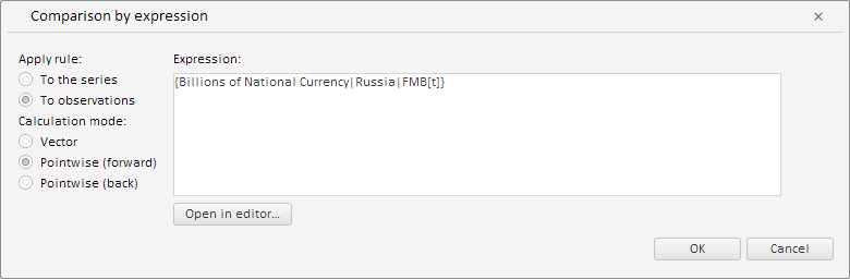 After executing the example, validation rule in this wizard is applied to observations, pointwise forward calculation method is set, and the expression text says {Billions of National Currency|Russia|FMB[t]}: