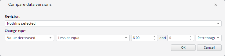 After executing the example the "Nothing is selected" value is set in the Data Revision field of this wizard, the Changes Type group shows: "Value has decreased", comparison operator is Less Than or Equal, and the value is set to 3%: