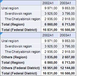 The example of a table with hierarchical totals not showing the Other aggregate (upper table) and showing the Other aggregate (lower table):