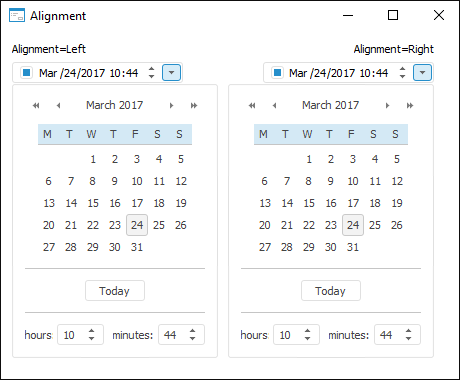 The Alignment property determines the type of alignment of the drop-down calendar relative to the component borders.