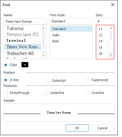 Clicking the button opens the dialog box of font selection with limited possibility to select font size: