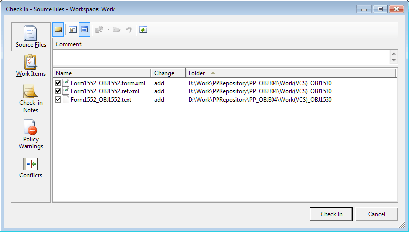 When a conflict arises related to pending changes in moved objects, the developer who gets the error message "TF10141: No files checked in: resolve the conflicts and try again" must resolve this conflict locally. To do this, refresh repository in the object navigator, get latest version of the folder, to which the object was moved, and check in the changes. Select the required method of conflict solving in the Resolve Conflicts dialog box. If automatic conflict solving has been selected, select the name of the file on the server in the dialog box that opens requesting the new file name.