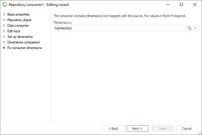 To fix selection of the data consumer dimensions, which were not mapped with data source dimensions, use the Fix Consumer Dimensions page. The page is available if the existing cube or time series database is selected as a data consumer, and at least one dimension binding is reset on the Dimensions Comparison page.