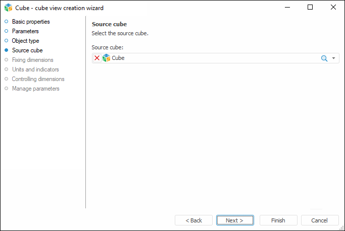 The Source Cube page is used to select the cube, based on which a cube view is created.