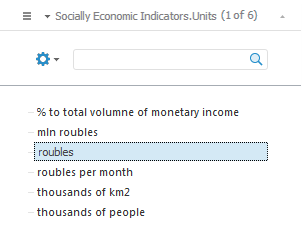 The Selection group of tabs of the side panel displays the Socio-Economic Indicators.Units dimension built by values of the Measurement Units attribute.