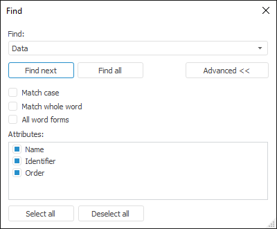 Find Next. The first found element gets focus. Clicking this button again moves the focus to the next found element and so on. An information message is displayed when the dictionary reaches the end.