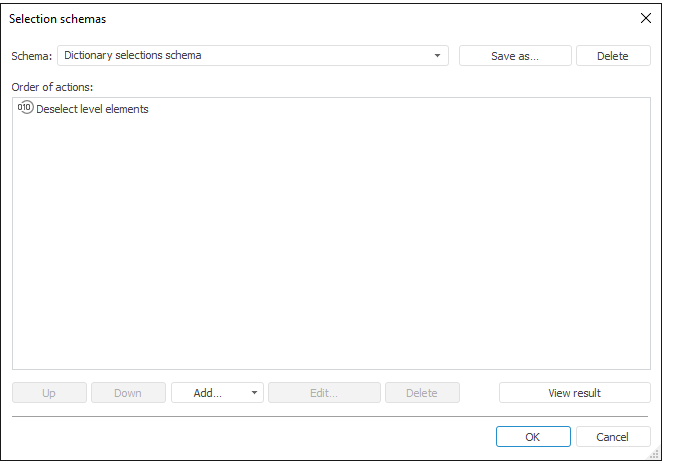 In the Selection Schemas dialog box click the Add button and select the Select Level item in the drop-down list. The Select Level Elements item is added to the Order of Actions list: