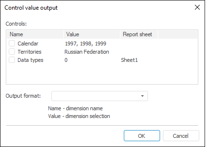 To add a control value to header or footer, click the button in the header or footer editing dialog box. The Control Value Output dialog box opens: