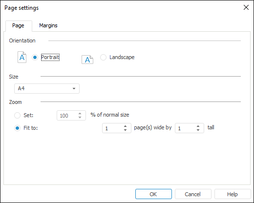 Workspace page settings are made in the Page Settings dialog box. To open the dialog box, select the Document > Print > Page Settings main menu item.