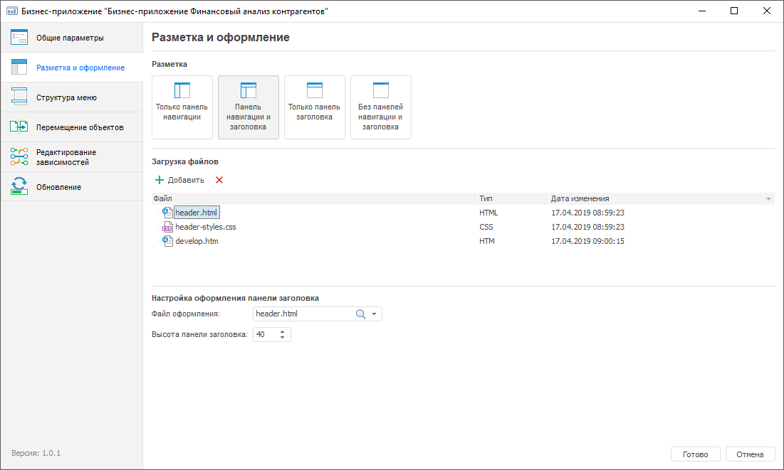 Настройка разметки и оформления позволяет выбрать вариант отображения панелей веб-приложения: