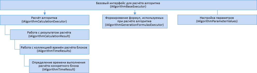 Для расчёта алгоритма предназначен базовый интерфейс IAlgorithmBaseExecutor, который является родителем интерфейсов IAlgorithmCalculationExecutor, IAlgorithmGenerationFormulasExecutor. Расчёт алгоритма может выполняться синхронно или асинхронно при использовании многопоточного расчёта.