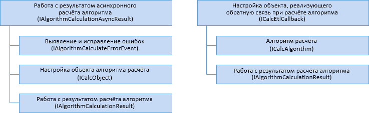 Для работы с алгоритмом расчёта предназначен интерфейс ICalcAlgorithm, который взаимодействует с другими интерфейсами с помощью свойств и методов.