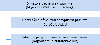 Для отладки расчёта алгоритма предназначен интерфейс IAlgorithmCalculationDebug, с помощью которого можно получить результат расчёта алгоритма и объекты, используемые при расчёте.