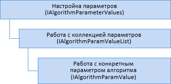 Для настройки параметров алгоритма расчёта предназначен интерфейс IAlgorithmParameterValues, с помощью которого можно получить коллекцию параметров и настраивать конкретный параметр алгоритма расчёта.