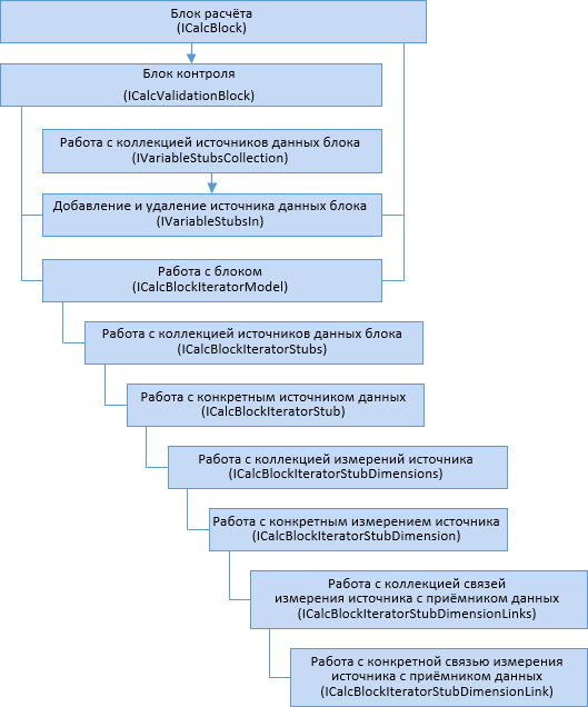 Интерфейс, предназначенный для работы с блоком расчёта, ICalcBlock является родителем интерфейса ICalcValidationBlock, предназначенного для работы с блоком контроля. С помощью свойств и методов интерфейса ICalcBlock можно перейти к настройкам блока из других интерфейсов.