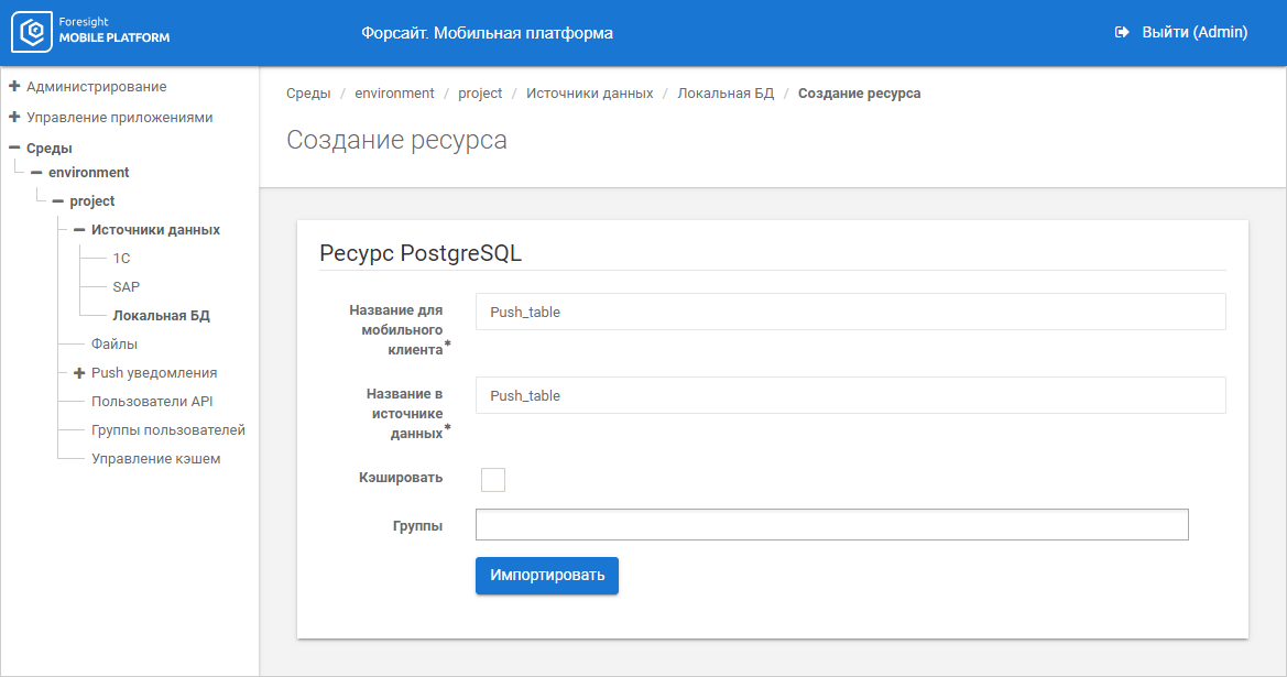 Примечание. По умолчанию источник данных Локальная БД является базой данных PostgreSQL. При добавлении источника данных Локальная БД на сервере мобильной платформы создается внешнее API, с помощью которого доступно управление данными в источнике.