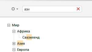 В строку поиска введите искомый текст. Элементы, в которых встречается заданная подстрока, будут выведены в дереве элементов с их родительскими и дочерними элементами: