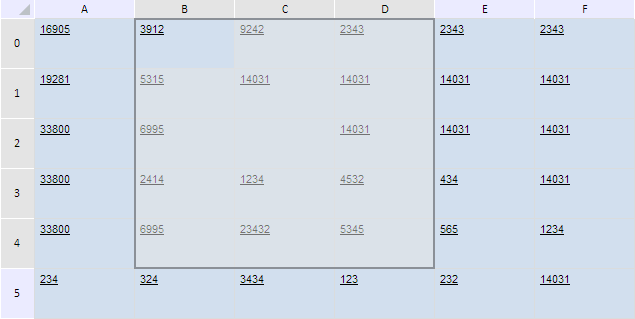 В результате выполнения примера диапазон, состоящий из одной ячейки C2, был расширен на две строки вверх и вниз, а также один столбец влево и вправо. Значение исходной ячейки было стёрто, ширина таблицы изменилась до 700 пикселей, а её высота - до 350 пикселей: