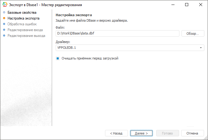 Укажите каталог-приёмник с файлами Dbase и драйвер для соответствующей версии Dbase.