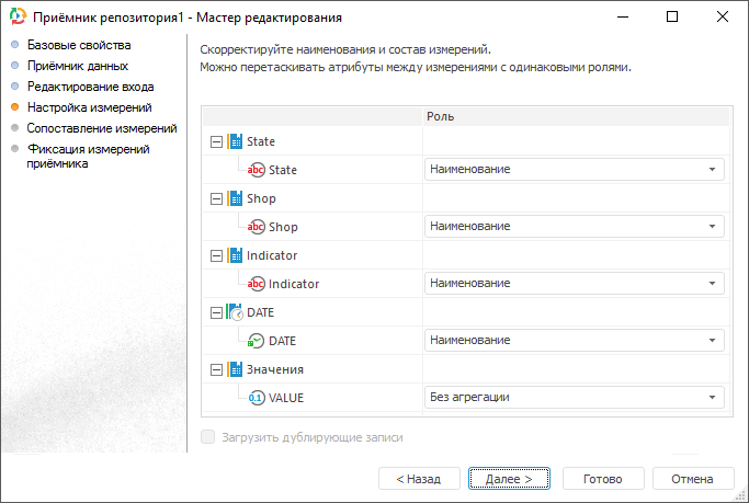 Примечание. При выборе в качестве приёмника стандартного куба, базы данных временных рядов, табличного справочника НСИ или составного табличного справочника НСИ, флажок «Очищать приёмник перед загрузкой» и кнопка «Редактировать объект» будут недоступны.