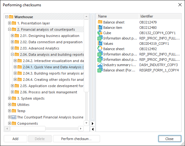 After executing the action, the list of objects for checksum performing will be generated in the right dialog box part.