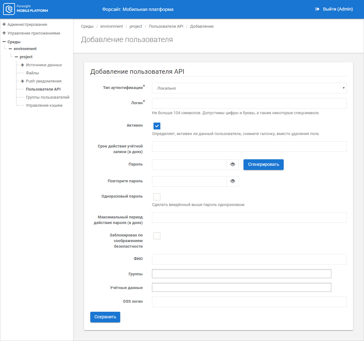Active. Select the checkbox to activate the user in the system and to be able to work with the mobile platform. The active user can execute authentication and various API requests. If the checkbox is deselected, the user is deactivated.