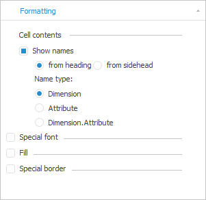 The contents displaying setup is available for the corner: custom text, dimension names and/or dimension attribute.
