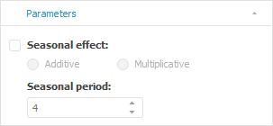 Seasonal Period. Determine the length of the seasonal period by means of the value editor or the keyboard. The parameter is used if any seasonal effect is specified.
