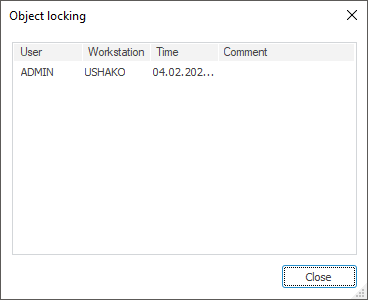 To view the list of users who locked the object, select the Lockings item in the object's context menu. The Object Locking dialog box opens: