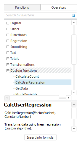 Custom functions are not connected to the tools by default, and they should be entered manually in the expression each time to be used. Foresight Analytics Platform enables the user to connect custom functions to system functions in all tools defined above.