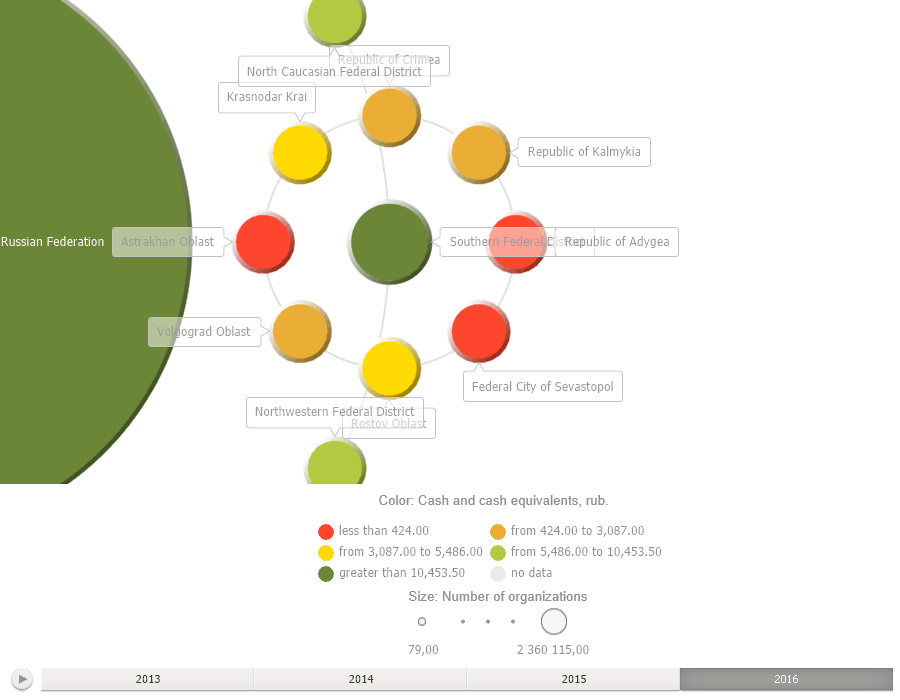 A bubble tree displays hierarchical data as a set of interrelated bubbles. Each hierarchical branch is represented with a bubble related with bubbles that are elements of the same hierarchical level. All elements of the same branch and the same hierarchical level form a circle, the center of which shows the parent element of the hierarchy. Each bubble's diameter is proportional to the value of the corresponding hierarchical element. Bubble color also depends on value of the hierarchical element.