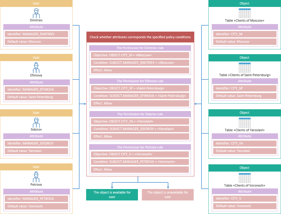 The access is restricted via policies and rules that contains a set of conditions to check attributes. This method provides the possibility to create combinations of conditions for expressing various policies. Granting user access to the object or data segment occurs only if the values of the user and object attributes allow the user to grant the access to the object.