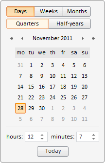 The component provides an option of selecting calendar displaying mode using the Days, Weeks, Months, Quarters and Half-years buttons at the top of the calendar.