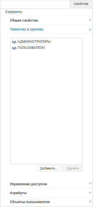 Для добавления пользователя в состав группы пользователей используйте вкладку «Членство в группах» в окне «Свойства пользователя» настольного приложения и на боковой панели «Свойства» в веб-приложении: