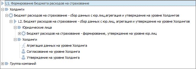 1. Выделите в дереве процессов или в рабочей области подпроцесс «Бюджет расходов на страхование – сбор данных с юр.лиц, агрегация и утверждение на уровне Холдингов» с ручным способом исполнения и нажмите на кнопку  «Завершить». Для установки параметров группового вызова будет открыто окно «Запуск подпроцессов»: