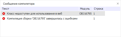 При выборе режима «Веб приложение», если в тексте макроса содержится код, попадающий под указанные ограничения, то генерируется сообщение об ошибке «Класс/Метод недоступен для использования в веб».