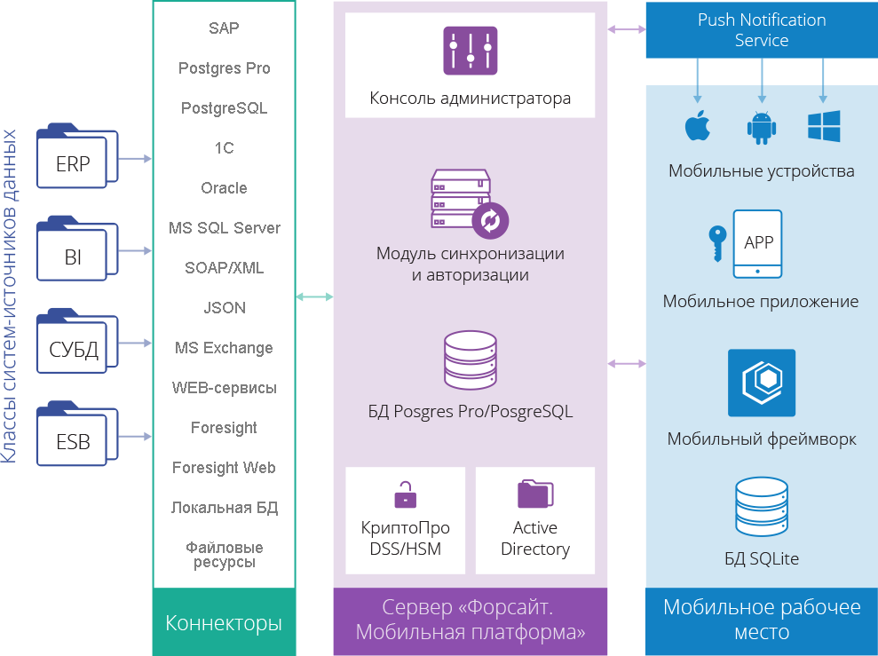 Функциональная архитектура программного продукта основана на подключении источников данных к серверу мобильной платформы и синхронизации с мобильными устройствами через Framework мобильного приложения.