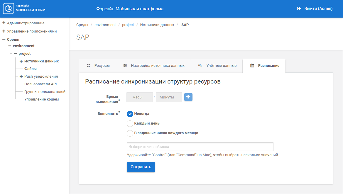 Нажмите кнопку «Сохранить» для сохранения изменений. После выполнения действий будет задано расписание для синхронизации структур ресурсов между сервером мобильной платформы и источником данных.