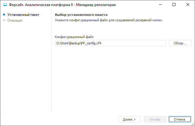 В поле «Конфигурационный файл» укажите конфигурационный файл, созданный ранее. Все созданные резервные копии сохраняются в том же каталоге, в котором находится конфигурационный файл.