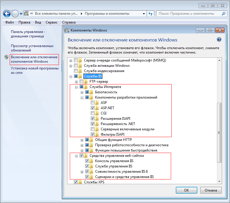 3. Нажмите на ссылку «Включение или отключение компонентов Windows» в левой части окна. Будет открыто окно «Компоненты Windows». Установите флажки в разделе «Службы IIS», как показано на рисунке ниже: