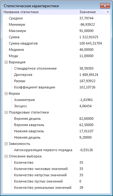 Статистика по выбранному диапазону будет отображена в окне «Статистические характеристики»: