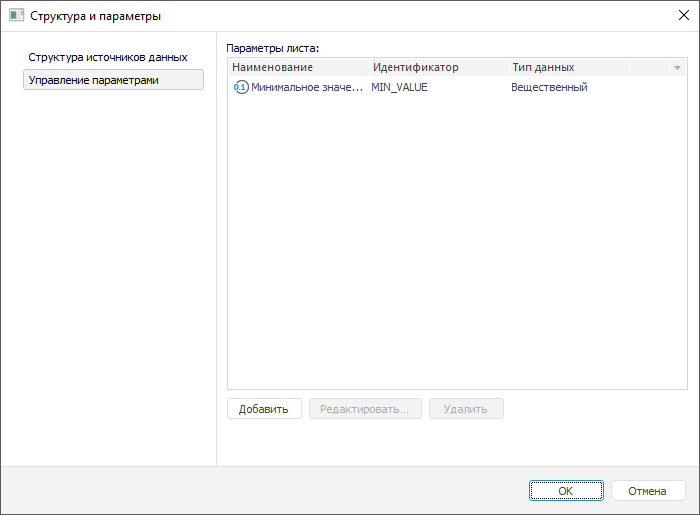 Для создания и редактировании параметров листа экспресс-отчёта используйте вкладку «Управление параметрами» в диалоге «Структура и параметры».
