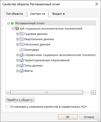 Для объектов, использующих справочники НСИ (например, регламентные отчеты, экспресс-отчеты, виртуальные кубы, рабочие книги), можно настроить отслеживание целостности при удалении элементов из справочников НСИ. При удалении таких элементов из справочника НСИ выдается предупреждение о том, что элементы используются другими объектами и их удаление приведет к порче этих объектов. Подробнее об отслеживании ссылок написано в разделе «Описание структуры».